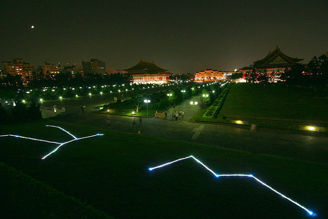浪漫的中國七夕情人節卻還得上工,今晚在中正紀念堂大忠門內,舉辦了這場《仰觀蒼穹400年特展~浪漫七夕踏鵲橋》,主辦單位特別在中正紀念堂周邊的草坪上,使用先進的LED燈具,設立了由18個星座組成的「草原星空」,做為七夕活動的主軸內容。